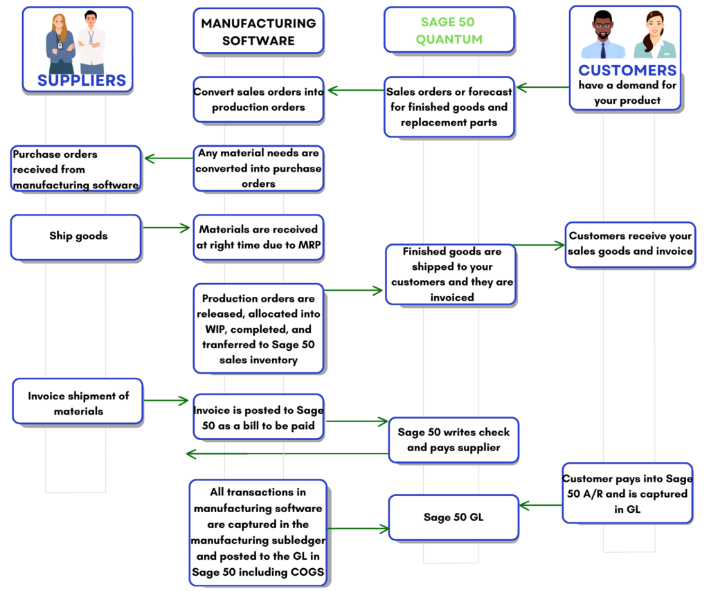 Use your Sage 50 accounting software to manage everything related to customers, such as customer records, sales orders, sales inventory, accounts receivable, accounts payable, and the general ledger. The manufacturing software will manage everything related to manufacturing: bills of material, raw material inventory, production scheduling, purchasing, etc. The manufacturing software maintains a sub-ledger of all manufacturing costs and syncs with your Sage 50 general ledger. The transactions are fully auditable and are done automatically – no double data entry is required.