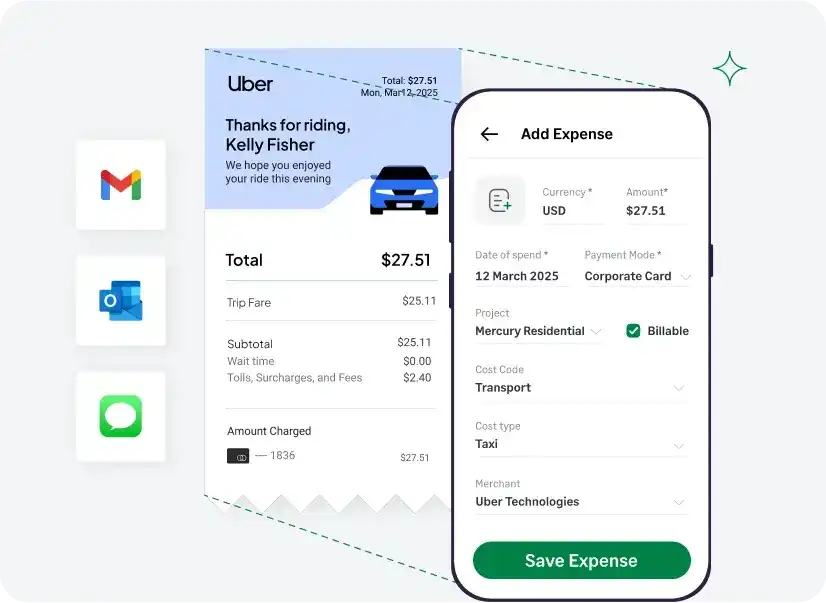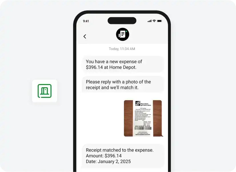 - Submit Receipts by Text, Email, Slack, or Mobile: Employees simply reply to a text or forward receipts from Gmail, Outlook, Slack, or the mobile app. AI automatically extracts the merchant, date, amount, and category.